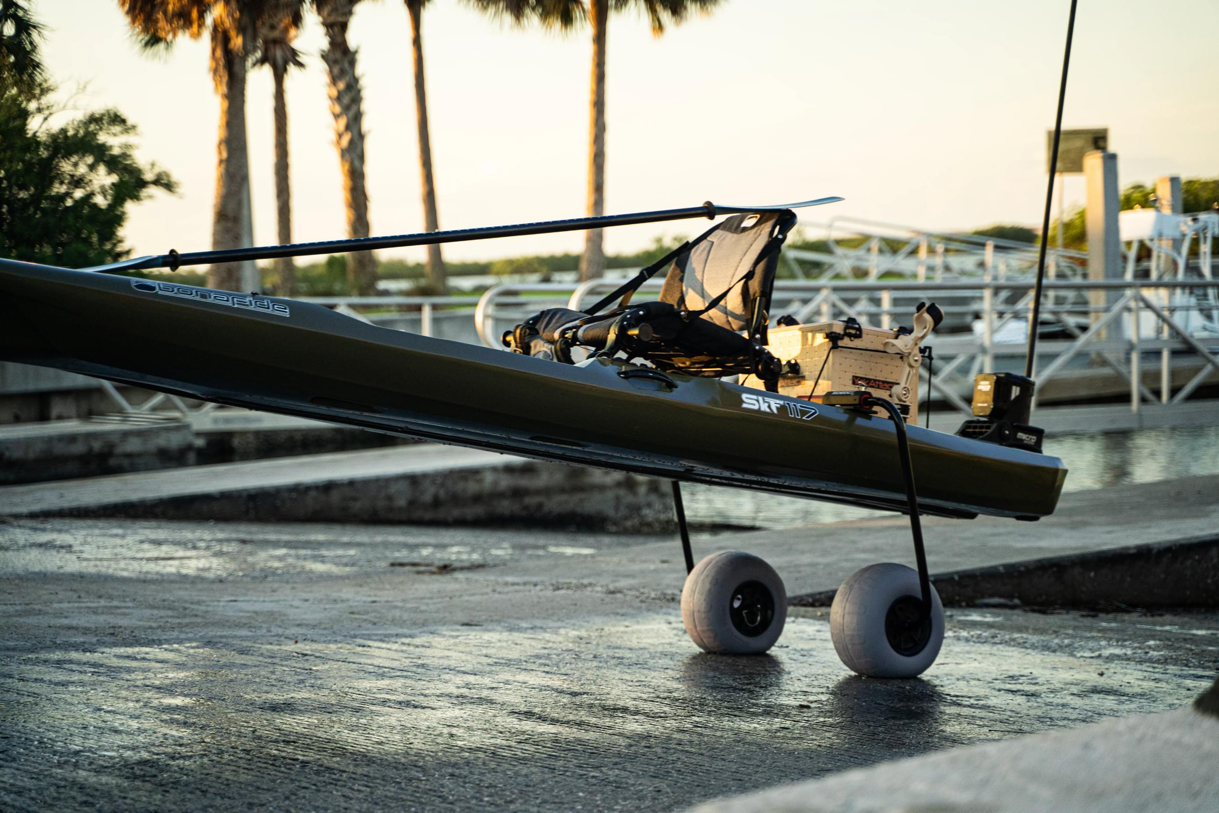 Installing either the Bonafide Sidekick Wheel System along the rear gear tracks or the Tag Along System, which will bolt to the rear of the kayak, makes transporting the SKF117 easy. With handles at the stern, mid-ship, and bow, manipulating this kayak off the water has never been easier.