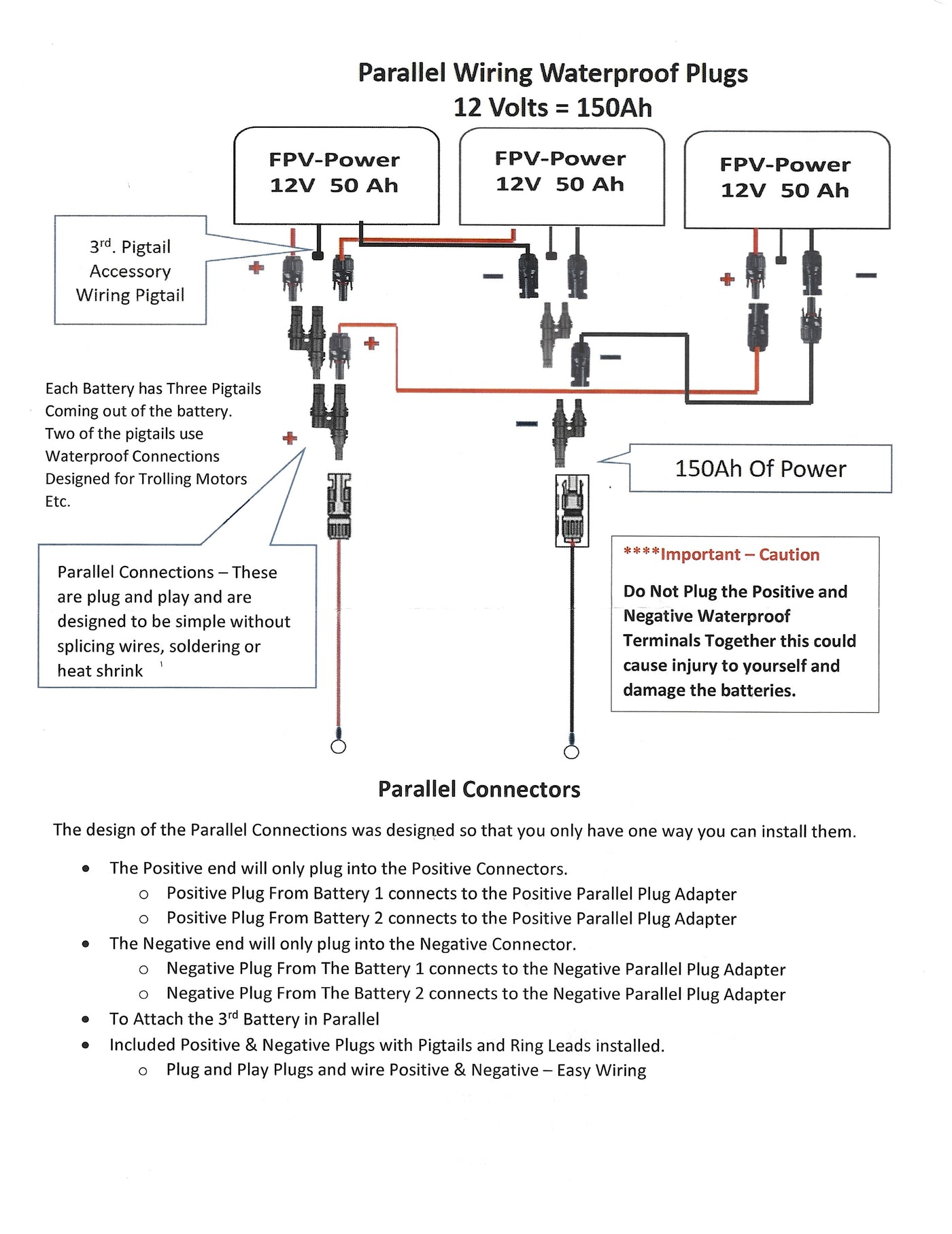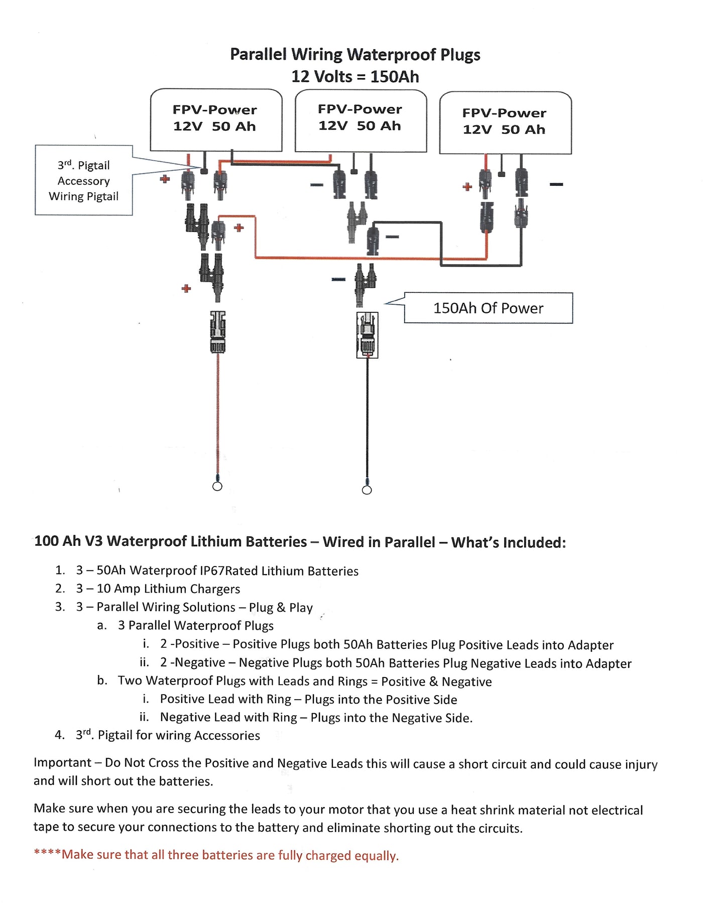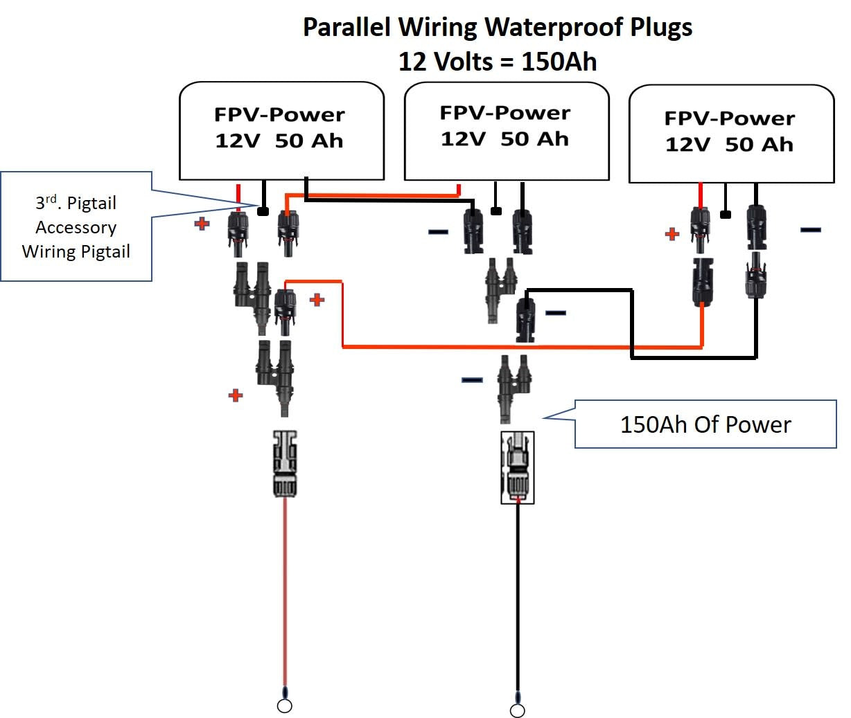 Discover the ultimate solution for all your power needs with the FPV-Power 150ah 3x50Ah V3 Lithium Batteries in Parallel. Enjoy the unbeatable performance with the three high-quality waterproof IP67-rated 50Ah Lithium Ion Polymer batteries and parallel wiring options, providing a total of 150Ah of power. You will receive (3) 10Ah lithium chargers, so you can charge both batteries simultaneously, saving you valuable time. For the parallel plug-and-play wiring system, you will receive (3) parallel waterproof plugs and (2) leads and rings for positive and negative. A third pigtail is attached to the battery directly for any accessories you may have. All three positive plugs from the batteries will plug into the positive MC4 Branch Connector, followed by plugging the positive MC4 Branch Connector into the positive parallel waterproof connector, rated at 60A. These steps are repeated for the negative side as well. These waterproof connections are designed for powering items such as your trolling motor. Within moments, you can triple your battery life by utilizing parallel connectors. This leads to a longer time on the water, which everyone can enjoy!