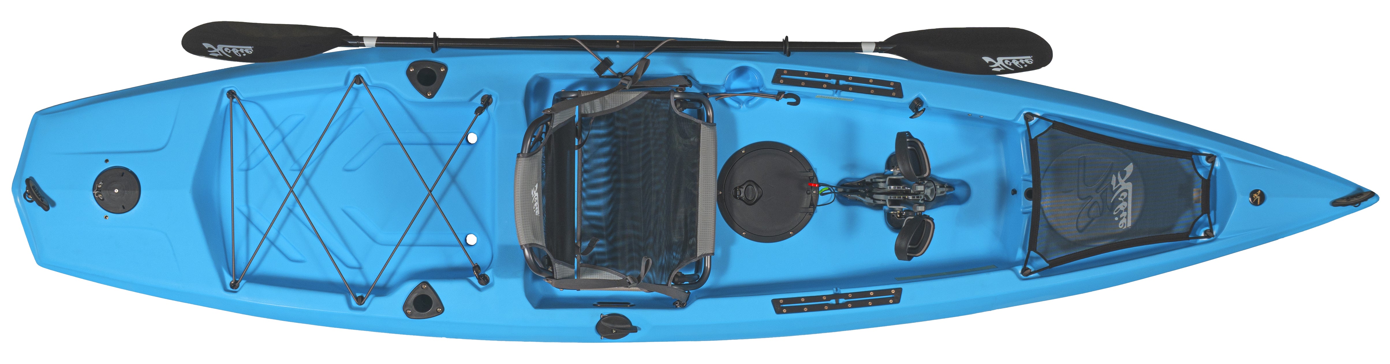 Whether you're spending the day on the water fishing or enjoying the beautiful weather, the Compass offers a variety of features for everyone. With plenty of room to spare from the cockpit to the cargo area, it's up to you to find the best fit for you. The covered bow storage area leaves plenty of room and concealment to keep things out of the way. At the same time, the rear cargo features an open plan with crisscross bungees that hold your fishing crate or cooler. You'll also find plenty of space under your chair, allowing for more storage for tackle boxes and other amenities. Along the side of the kayak, you'll find a bungee attachment to hold the included two-piece fiberglass paddle. Storing it out of the way but ready for use.