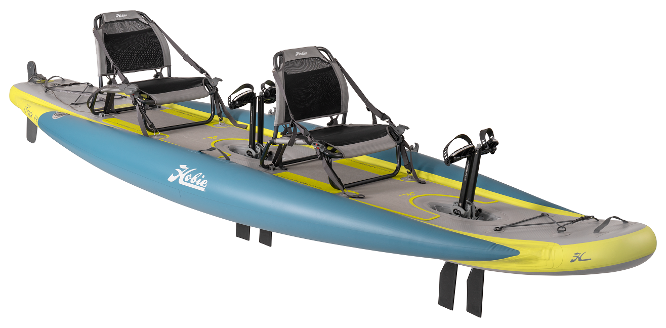 Take your adventure to the next level with the Hobie Mirage iTrek 14 Duo Inflatable Kayak. This tandem inflatable kayak is enhanced to take comfort to the next level. The easy-to-use inflatable design combines not one but two Hobie MirageDrives with Glide Technology and Kick-Up Fins. A kayak that anyone can enjoy, perfect for your next family outing. Whether touring all day down the river or on a multi-sport adventure, the iTrek 14 Duo will handle it. The unmatched power and maneuverability of the MirageDrive GT allow you and a friend to glide across the water like never before.