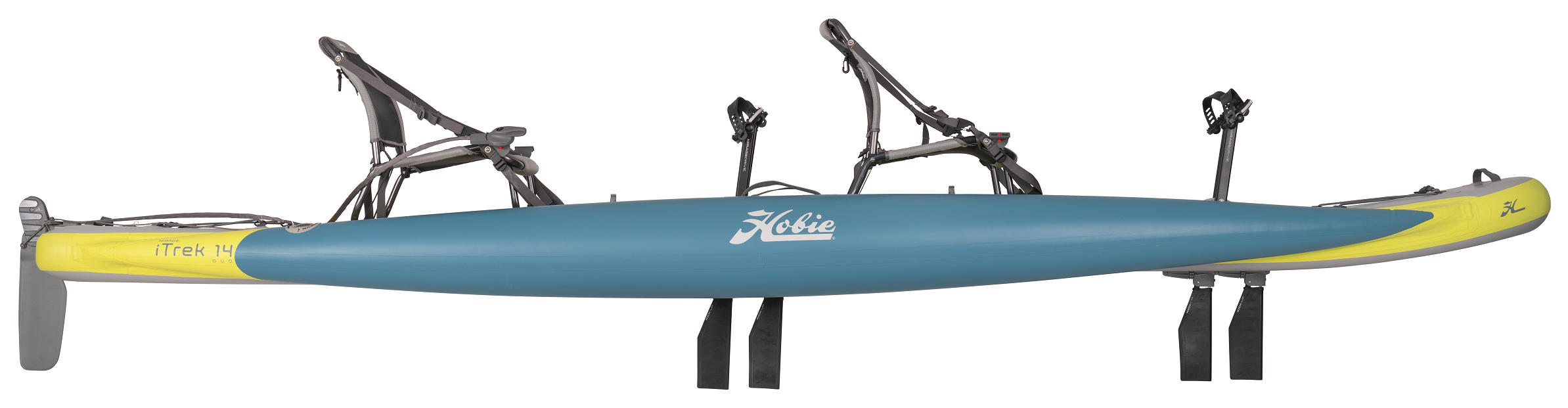 The Hobie Mirage iTrek 14 Duo Inflatable Kayak is fun and exciting, allowing you and a friend to enjoy its capabilities. The performance of the MirageDrives allows you to maneuver and fly across the water. Its convenient features enable anyone to enjoy and operate this unique inflatable. It is an excellent addition to any family and their kayak lineup. With improved stability and unmatched performance, the iTrek lineup is so popular. Don't miss out, and add the iTrek 14 Duo to the family today.