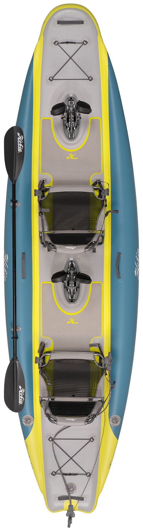 The layout of this inflatable kayak allows you to stay comfy for all-day use on the water, providing features that make your next adventure fun and convenient. The EVA deck pad offers comfort and traction, allowing you to easily stand and maneuver without slipping. Two comfortable nanomesh fabric seats allow for elevated seating. The adjustable seats will enable you to find your comfort zone; the breathable seats are easy to install. Access and steer the kayak with rudder control at your fingertips along the seat. A front and rear cargo area allows you to hold your coolers and supplies for a day on the water, easily secured with bungee tie-downs. You'll find four carry handles around the kayak, making transporting the inflated kayak a breeze. The kayak includes a Hobie three-piece paddle for the times you want to get a workout that day. The two included Hobie MirageDrive GTs, which are the heart and soul of this kayak, providing the ultimate pedaling experience.